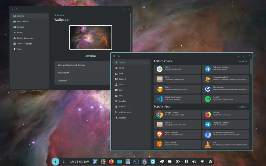 Pop OS (stylized as Pop!_OS) is a free and open-source Linux distribution based on Ubuntu and developed by the American Linux computer manufacturer System76. It features the COSMIC desktop environment; a Rust-based and Wayland-only desktop created and maintained by System76. Pop!_OS is primarily designed to ship with the company’s computers, but it can also be downloaded and installed on most PCs. Pop!_OS provides full out-of-the-box support for both AMD and Nvidia GPUs making it a top choice for gaming. The OS provides default disk encryption, streamlined window and workspace management, keyboard shortcuts for navigation as well as built-in power management profiles. The latest releases also have packages that allow for easy setup for TensorFlow and CUDA.