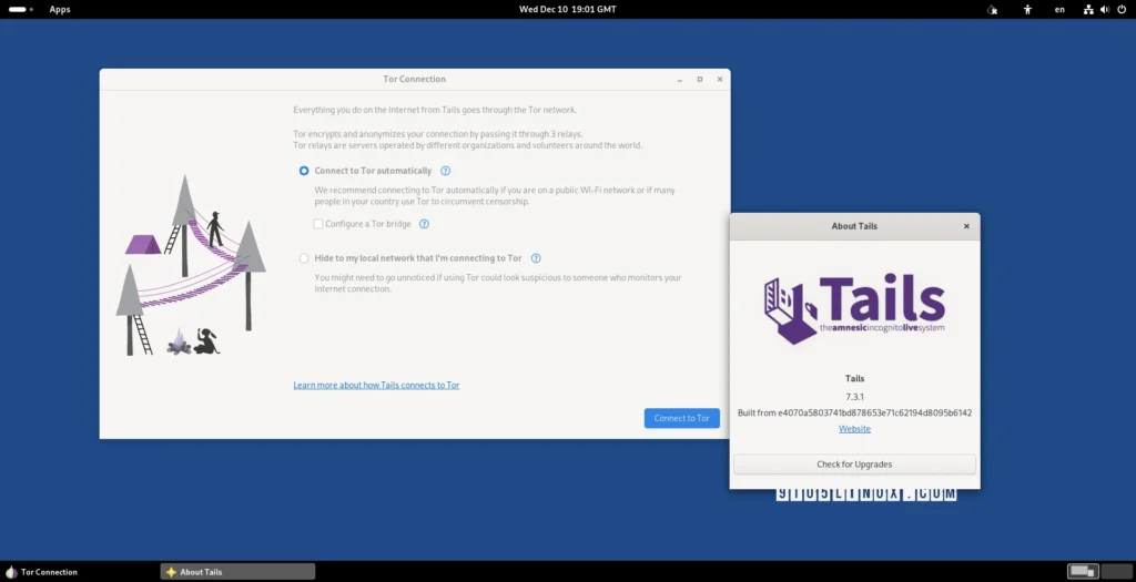 Tails or The Amnesic Incognito Live System is a security-focused Debian-based Linux distribution aimed at preserving privacy and anonymity. All its outgoing connections are forced to go through Tor, and non-anonymous connections are blocked.